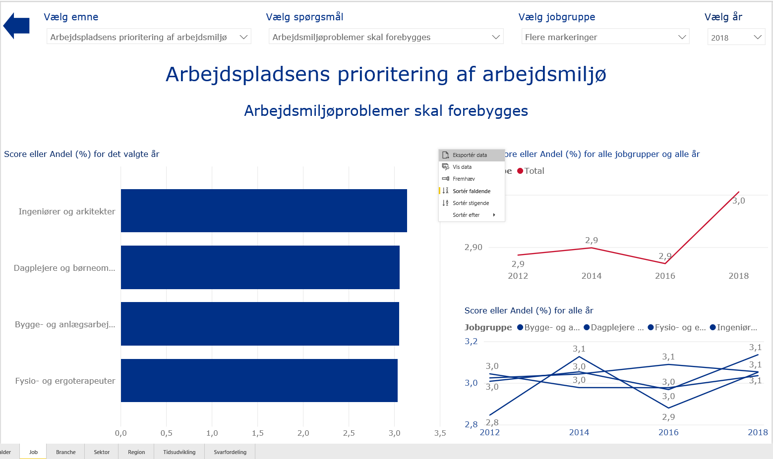 På visningen over tidsudvikling kan du se, hvordan udviklingen har været i arbejdsmiljø og helbred for alle beskæftigede lønmodtagere siden 2012. Også her vælger du emne og spørgsmål efter, hvad der interesserer dig. Du skal være særlig opmærksom på, at tallene tilpasser sig vinduet og akserne derved justeres løbende. Det betyder, at meget små ændringer kan virke store. Derfor bør du også kigge på tallene, der er skrevet i punkterne på kurven.