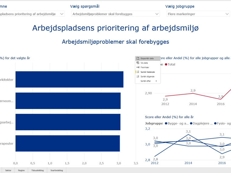 I datavisningen for undersøgelsen ’Arbejdsmiljø og Helbred’ (AH) kan du finde oplysninger om, hvordan beskæftigede lønmodtagere i Danmark vurderer deres arbejdsmiljø. Der er resultater for over 100 forskellige indikatorer for arbejdsmiljø og helbred fordelt på køn, aldersgrupper, jobtyper, brancher, sektorer og regioner.